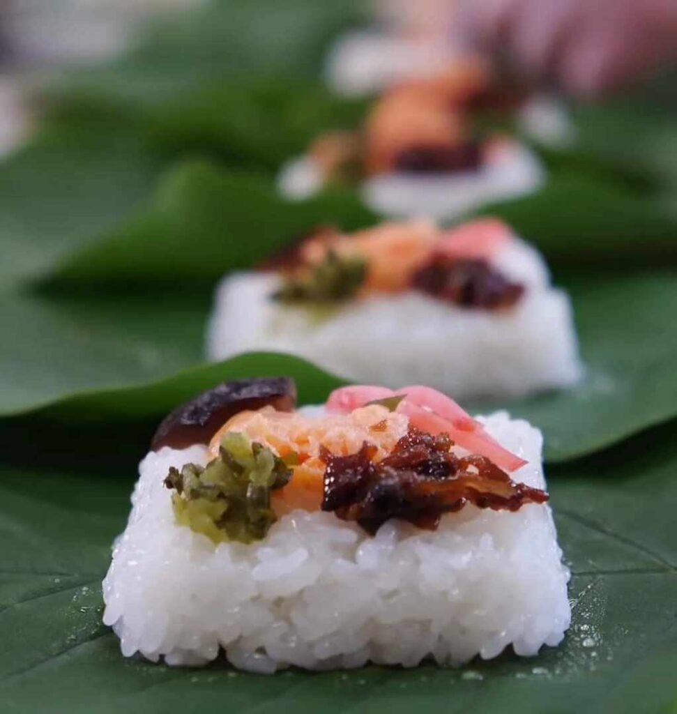 朴ノ木の葉っぱで包んだ「朴葉寿司」は、今も6月になると各家で作られており、たいていどこの家にも屋敷内に朴ノ木がある。季節になるとスーパーに、朴葉寿司で使う酢鯖や漬物などの材料が並んだコーナーが必ず作られることも、外から来た人間には新鮮に映る。同じく朴の葉で包んだ餅を蒸して作る「朴葉餅」、お米を小判型や団子に握って串に刺して、クルミやゴマが入った甘辛いたれをたっぷり塗って焼いた「五平餅」、スルメの麹漬け、黒スズメバチの幼虫「へぼ」の佃煮、こんにゃく芋から作る刺身こんにゃく等々、地味豊かなものばかり。